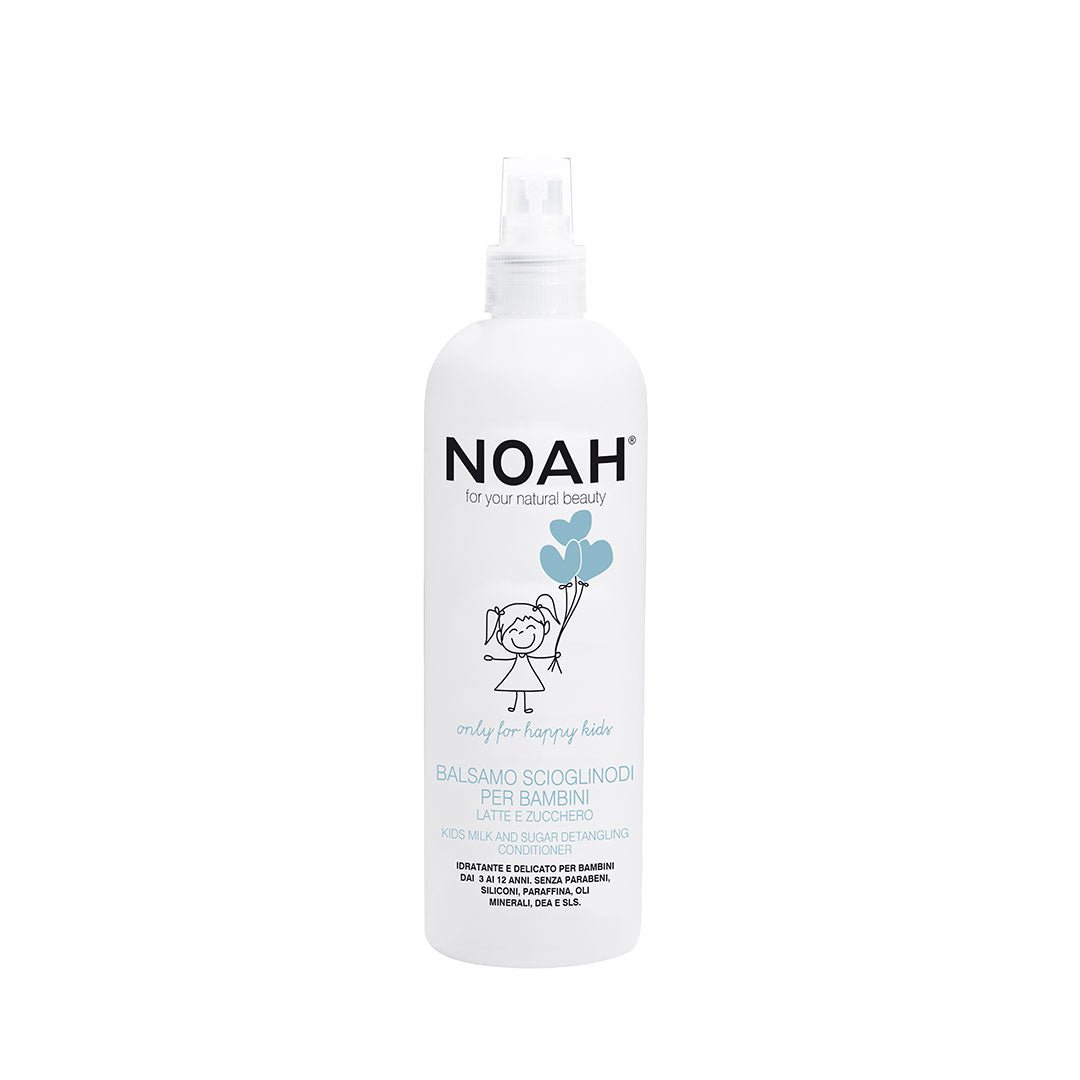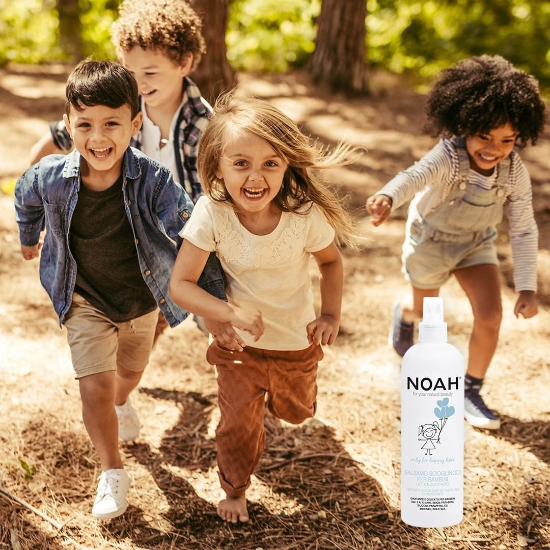 Balsamul spray pentru copii Noah, cu lapte si zahar, este ideal pentru descurcarea delicata a parului fragil sau incalcit. Formula sa blanda, imbogatita cu proteine din lapte si zahar, hidrateaza si fortifica firul de par, lasandu-l matasos, neted si usor de pieptanat. Balsamul reduce efectul antistatic si nu necesita clatire, fiind perfect pentru utilizare zilnica pe parul umed sau uscat. Produsele NOAH au un PH intre 2.8 and 5.