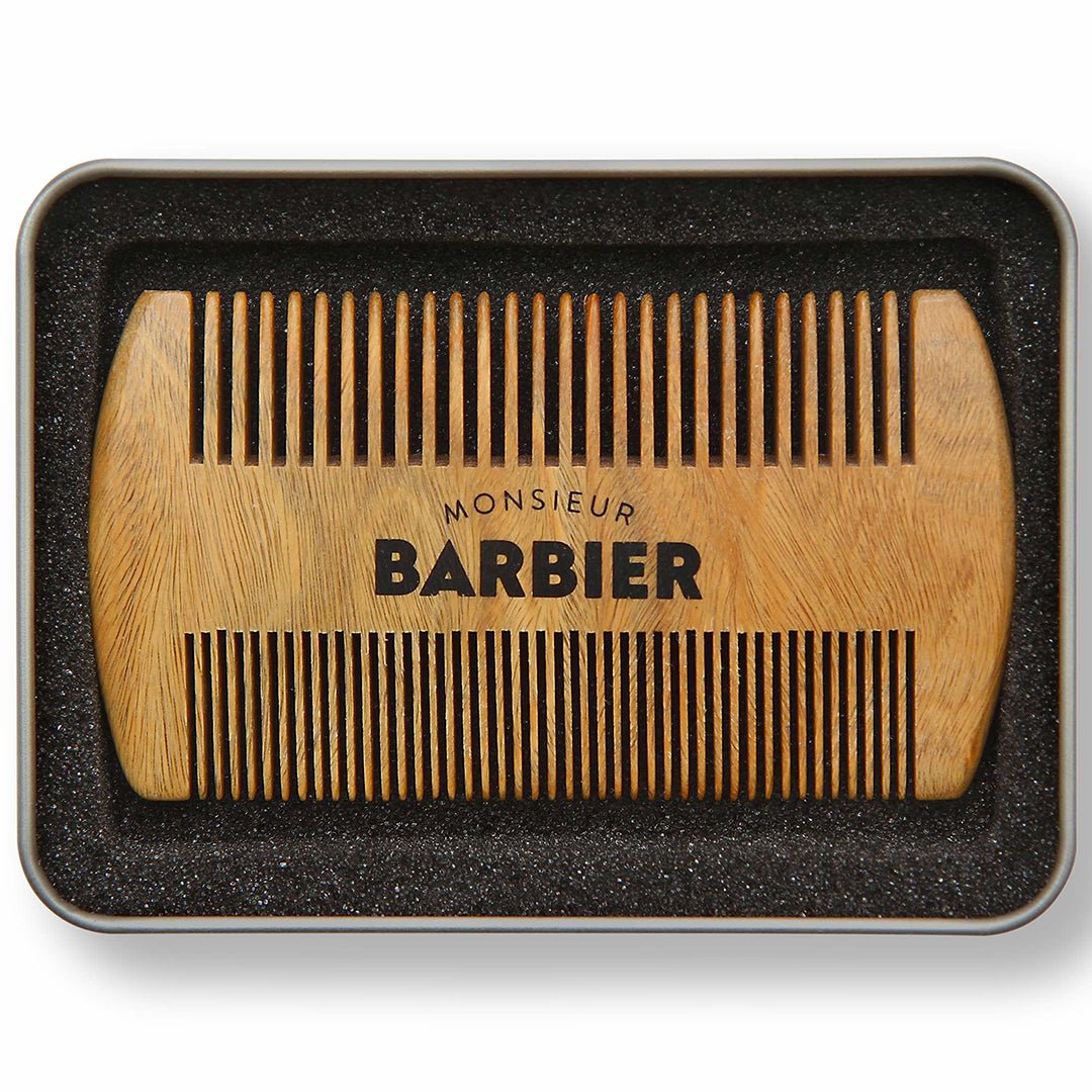 Defineste-ti stilul cu eleganta si precizie folosind pieptenele dublu pentru barba si par de la Monsieur Barbier. Realizat 100% din lemn de santal natural, acest pieptene combina utilitatea cu rafinamentul. Are doua fete: una cu dinti largi pentru barba si par lung, si una cu dinti fini pentru parul scurt sau pentru finisaje de precizie. Textura sa fina si parfumul lemnos subtil transforma fiecare moment de coafare intr-o experienta senzoriala placuta. Perfect pentru acasa sau in calatorii, pieptenele vine intr-o cutie metalica eleganta, gata sa-ti insoteasca rutina zilnica de ingrijire oriunde te-ai afla.
