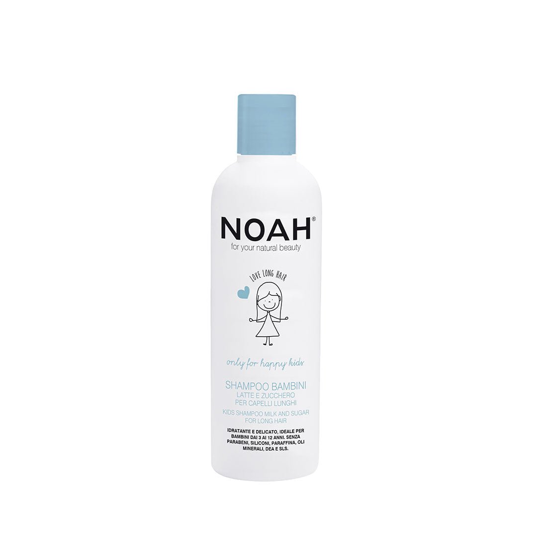 Samponul pentru copii Noah cu lapte si zahar este special formulat pentru a curata delicat parul lung si scalpul sensibil. Imbogatit cu proteine din lapte si zahar, samponul hidrateaza intens, fortifica firul de par si il face mai usor de descurcat. Textura cremoasa si parfumul delicat transforma spalatul pe cap intr-un moment placut si relaxant pentru cei mici. Produsele NOAH au un PH intre 2.8 and 5.
