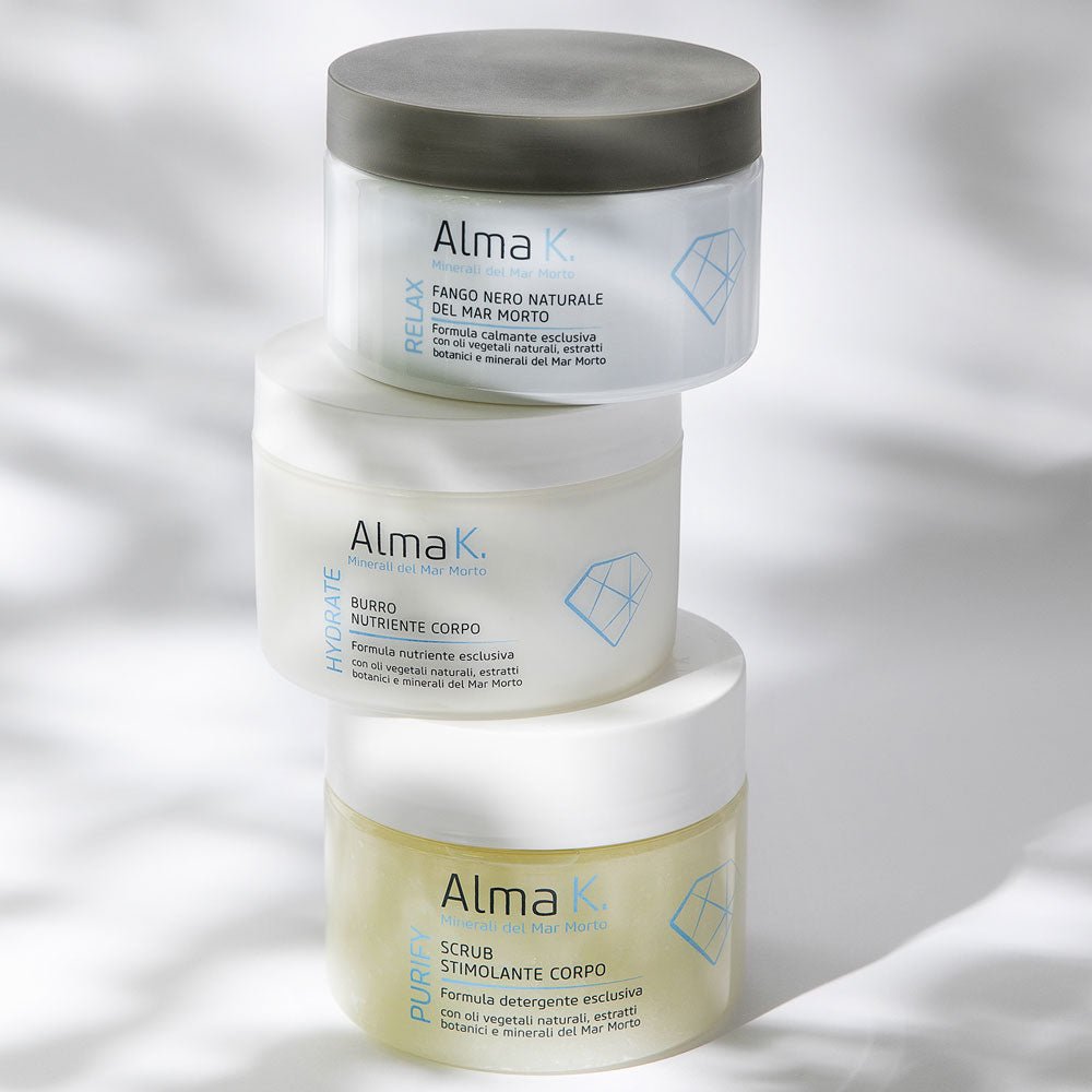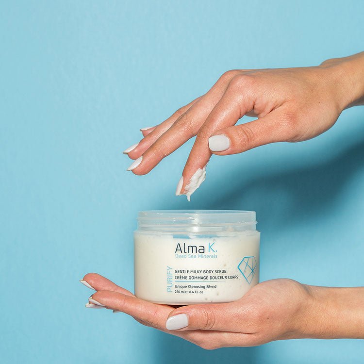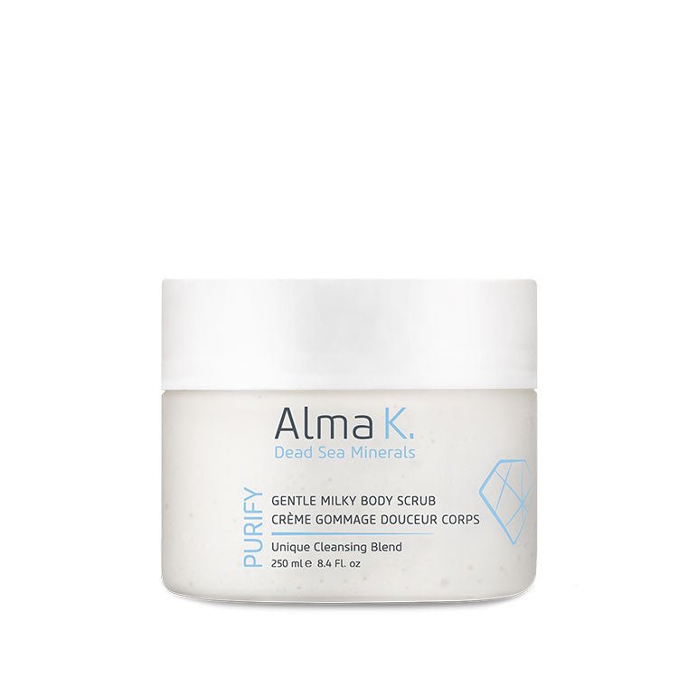 Bucura-te de un moment de rasfat delicat cu Scrubul Laptos pentru Corp Purify de la Alma K, special creat pentru pielea sensibila sau uscata. Formula sa cremoasa combina granule exfoliante fine cu ingrediente calmante si nutritive precum untul de shea, apa de la Marea Moarta, uleiul de jojoba si extractele de ceai alb si musetel. Indeparteaza impuritatile in timp ce hidrateaza intens, lasand pielea neteda, supla si perfect catifelata.