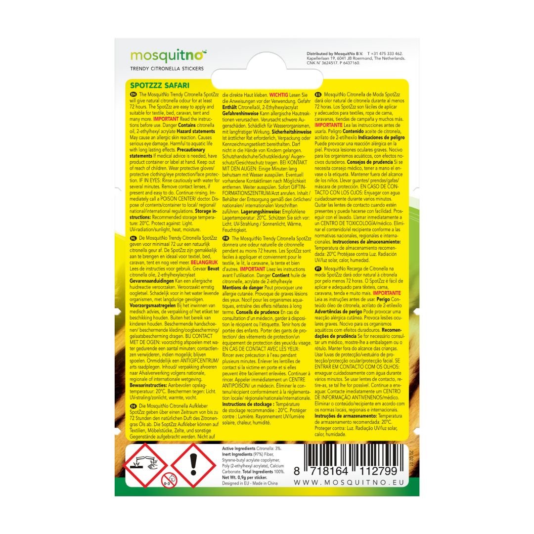 Stickerele MosquitNo Trendy Citronella SpotZzz emana parfum natural de citronella pentru minim 72 de ore. Usor de aplicat si pretabile pentru materiale textile, pat, caravane, corturi etc., stickerele protejeaza impotriva intepaturilor de tantari si insecte, pentru ca cei mici sa-si poata desfasura confortabil activitatile recreative.