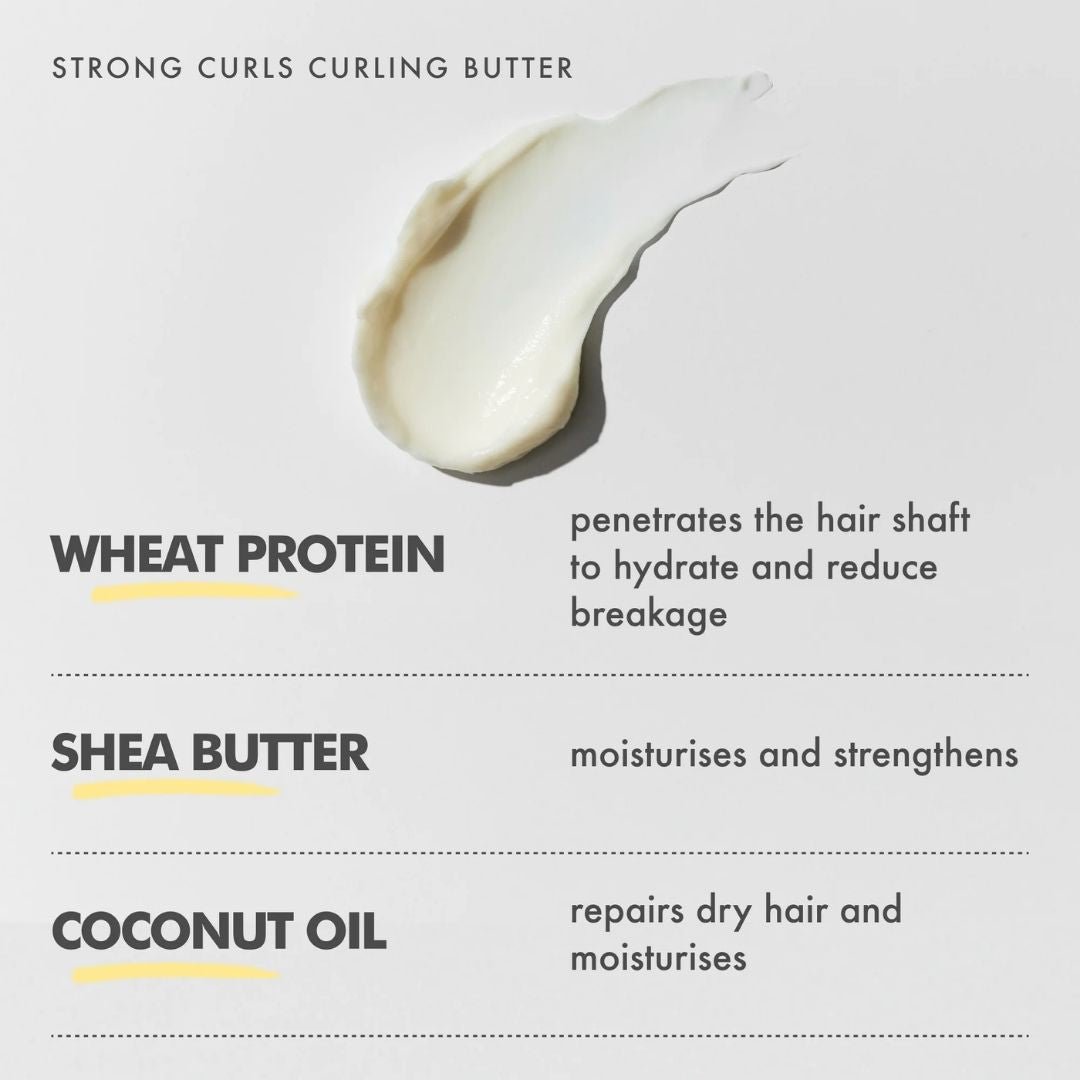 Hraneste, hidrateaza si defineste buclele cu Strong Curls Rosemary Oil & Biotin Curling Butter! Aceasta formula fara siliconi, 97% naturala, ofera fixare medie si este perfecta pentru bucle groase care au nevoie de hidratare intensa si protectie impotriva frizz-ului. Imbogatit cu biotina si ulei de rozmarin, acest unt de styling intareste firul de par, oferind in acelasi timp elasticitate si stralucire naturala. Potrivit parului ondulat, cret si foarte cret. Ideal pentru parul deteriorat. In ce pas din rutina integrez produsul?Stilizare